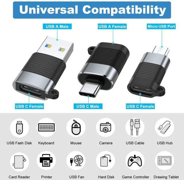 USB 3.0 Male to USB C Female AdapterConvert the USB A port of the laptops, chargers, or other devices to a USB C port, so you can connect USB C peripherals to devices. It can also provide a maximum data transfer rate of 5Gbps.