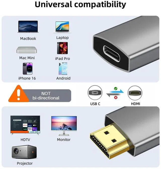 - [ONE WAY TRANSMISSION ONLY]: This USB C to HDMI adapter can only connect a USB C source (laptop/cell phone with DP Alt mode) to an HDMI monitor/projector/HDTV.This is one-way and does not support HDMI to USB-C. USB-C monitors are not supported to be used by plugging in from the HDMI computer side. Some cell phones and laptops do not output video from their USB-C ports, so please check before purchasing.