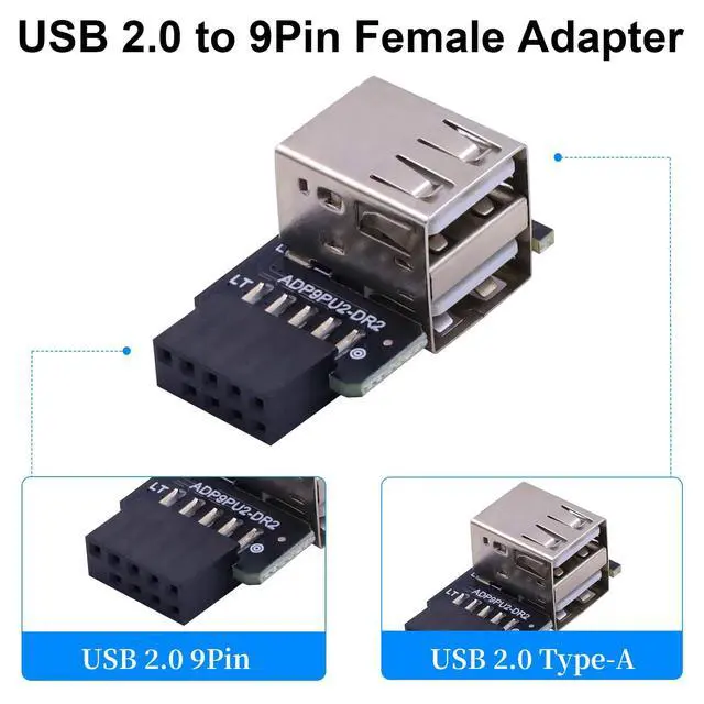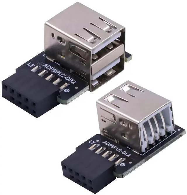 USB Header to USB Port, Connector 1: 9 PIN USB 2.0 Female Plug. Connector 2: Standard Dual USB 2.0 type A female connector. L-shape design:90 Degree Right Angle + Left Angle. Package: 2Pack. Material:PCB Board and Metal