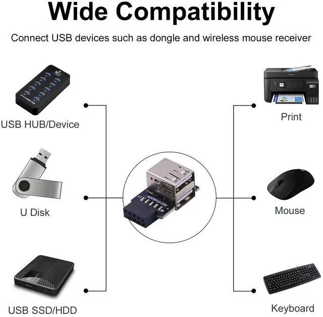 Function: Use this usb internal motherboard adapter to extende the USB 2.0 A Female Ports from PC USB 2.0 9Pin header.Support for Computer Motherboard Connector.