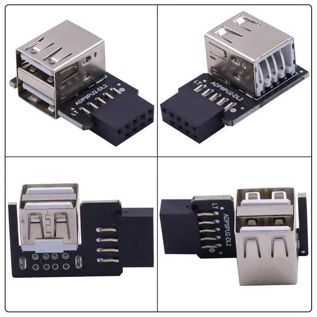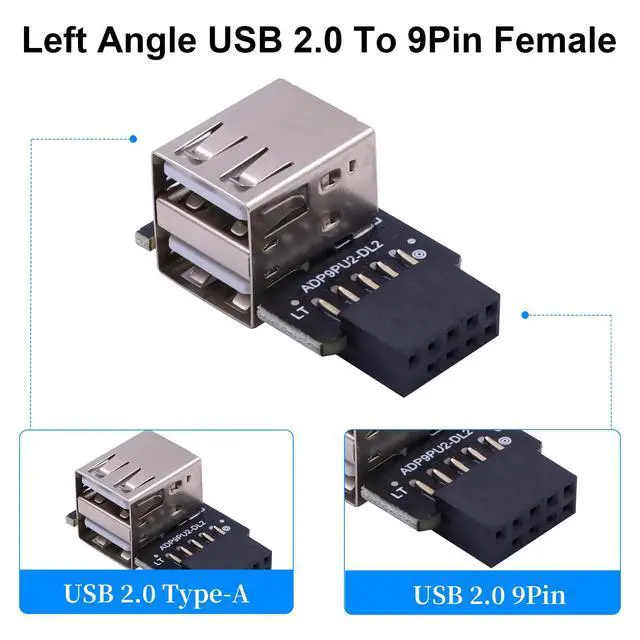 USB Header to USB Port, Connector 1: 9 PIN USB 2.0 Female Plug. Connector 2: Standard Dual USB 2.0 type A female connector. L-shape design: 90 Degree Left Angle. Package: 2Pack. Material:PCB Board and Metal