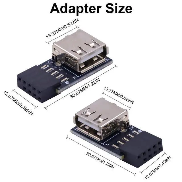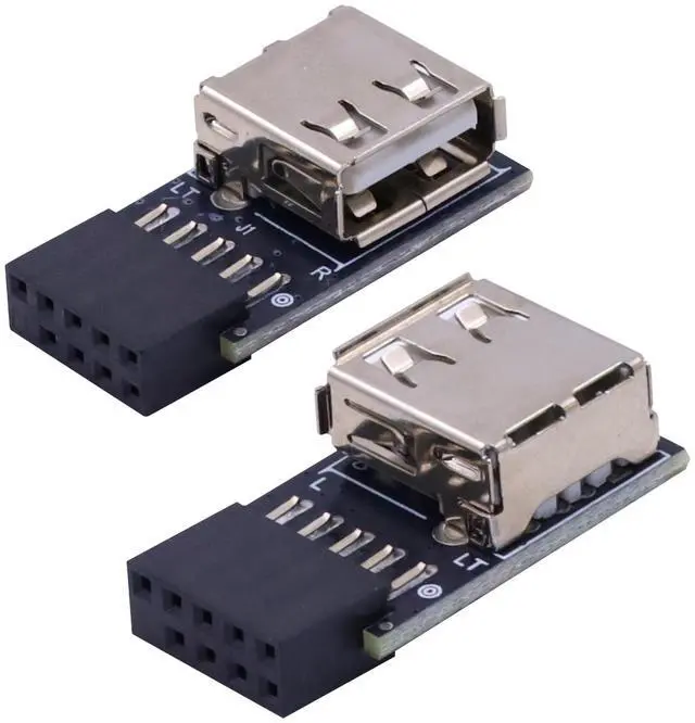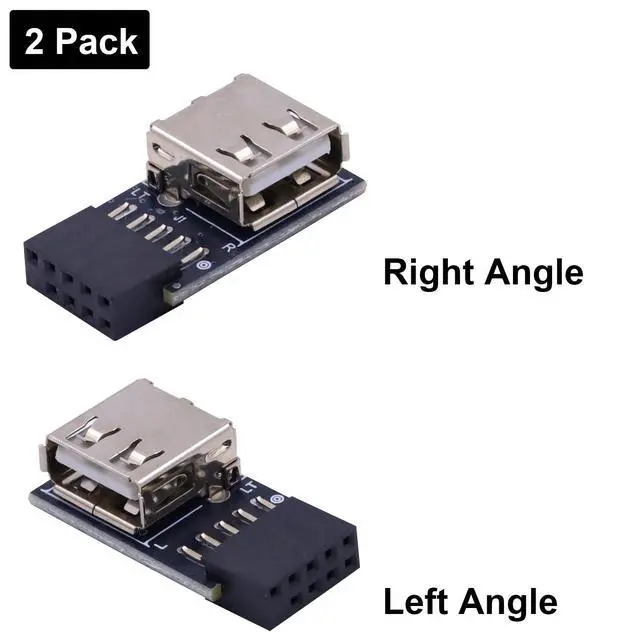 USB Header to USB Port, Connector 1: 9 PIN USB 2.0 Female Plug. Connector 2: Standard USB 2.0 type A female connector. L-shape design:90 Degree Right Angle + Left Angle. Package: 2Pack. Material:PCB Board and Metal