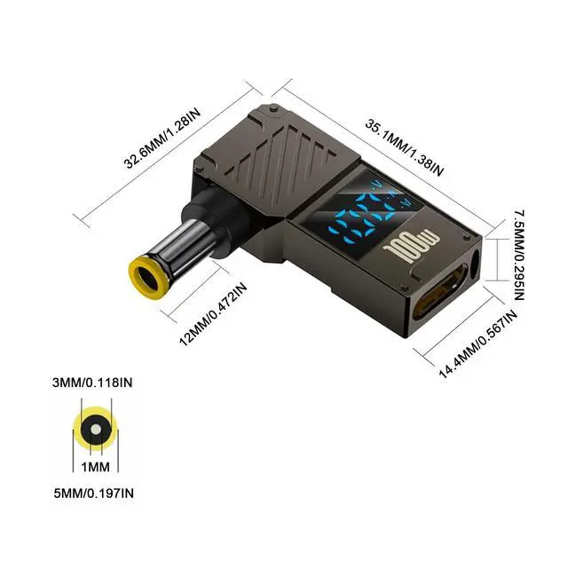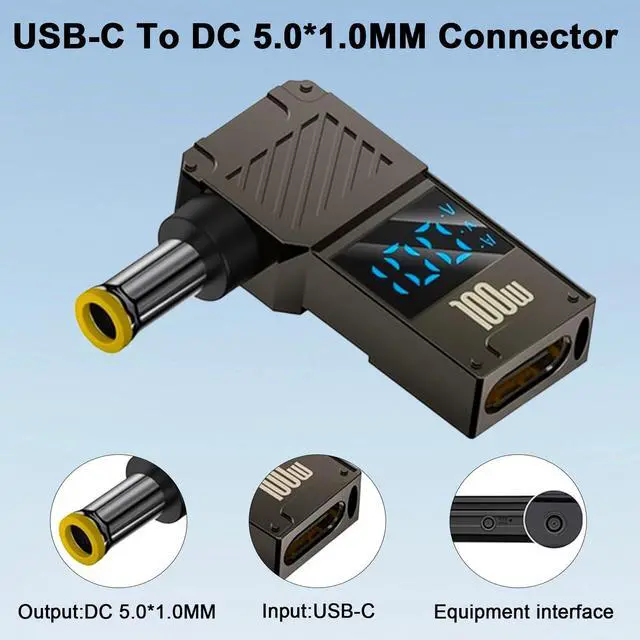 Vszerda 5.0x1.0mm DC Male Connector Jack, USB C Female to DC 5.0x1.0mm Adapter, 90 Degree 100W Output 20V 5A Power Adapter with LED Digital Display Charging Connector for Laptop, 1Pack