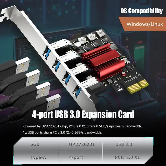 This 4-port USB 3.0 expansion card adds 4 x USB-A ports to desktop PC, server, or NAS via a PCI-Express x1 slot. Powered by NEC720201, the 4 ports share a 5Gbps bandwidth of PCIe 2.0 X1 and are compatible with Intel, AMD, and ARM platforms.