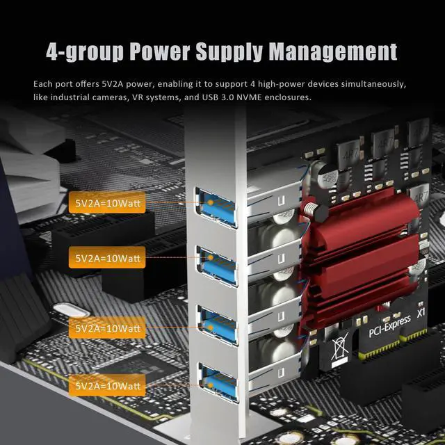 Each port offers 5V2A power (5V/8A 40W in total), enabling it to support 4 high-power devices simultaneously, like industrial cameras, VR systems, and USB 3.0 NVME enclosures. (Note: Not for fast charging, max 5V/0.5A charging only)