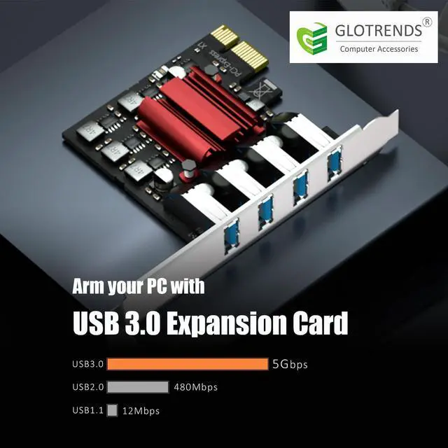 GLOTRENDS U3044BG 4-Port USB 3.0 Type-A 5Gb PCIe Expansion Card, Regular and Low-profile Bracket, Compatible with Windows and Linux (Not Support Mac OS)