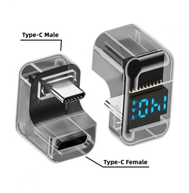 Type-C Smart LED Display USB-C Male to Female Extension Adapter USB4.0 40Gbps 140W Opposite U Shape Back Angled Current Voltage Monitoring