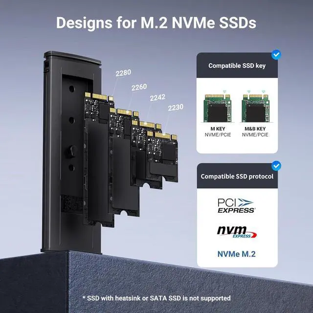 Broad Compatibility: The UGREEN M.2 NVMe SSD enclosure is specially designed to support NMVe protocol M/B&M keys and for 2230/ 2242/ 2260/2280 size SSDs up to 8TB. The M.2 NVMe enclosure is applicable for Windows, Mac OS, Linux, Android, IOS systems.(Does not support SATA NGFF SSD or mSATA SSD)