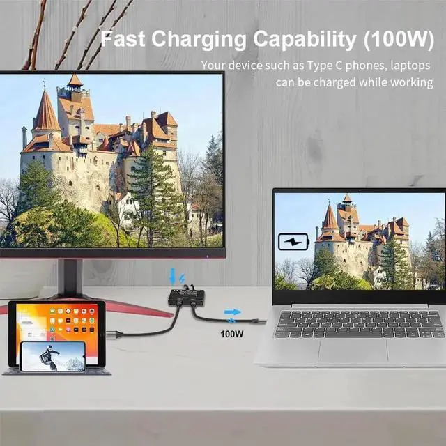 USB-C 8K Bi-Direction switch USB3.1 USB PD 3.0 splitter 1x2 / 2x1 DATA & VIDEO & PD100W switcher, used for computer monitor mobile phone, etc Multiple Source and displays