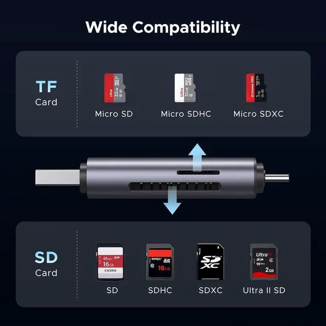 Universal Compatibility: The Memory Card Reader supports SDXC, SDHC, SD, MMC, RS-MMC, Micro SDXC, Micro SD, and Micro SDHC cards from devices like cameras, GoPro, dash cams, and surveillance cameras