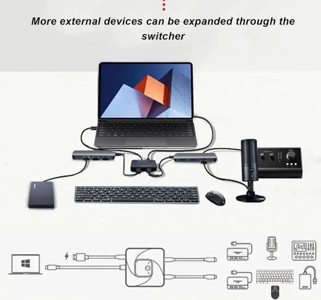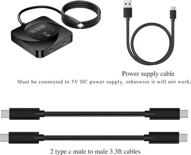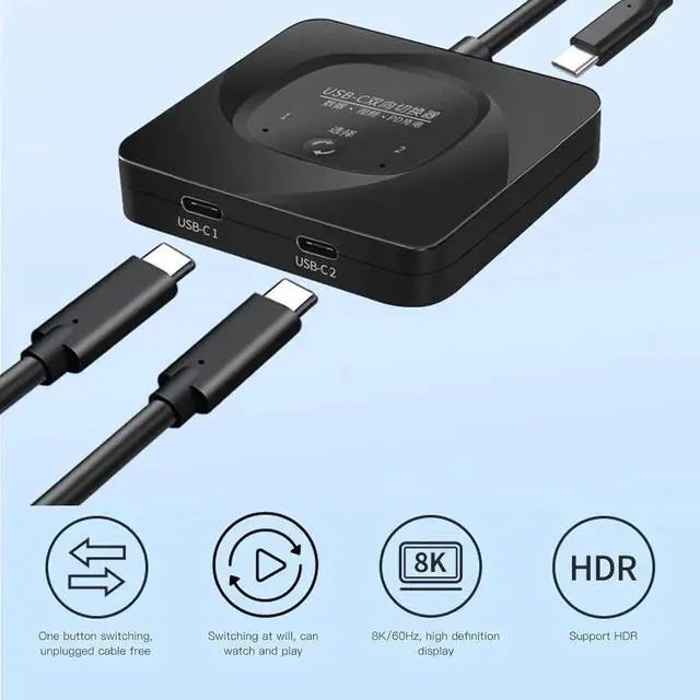 USB-C Bi-Direction Video&Data&Power Switch. This USB C switch can be used as a 2 in 1 out switch, which allows you to connect two sources devices to one display or USB C enable device; It can also be used as a 1 in 2 out switch that enables you to connect one source to two displays or USB C enable devices(Note that two displays or devices can not work at the same time);