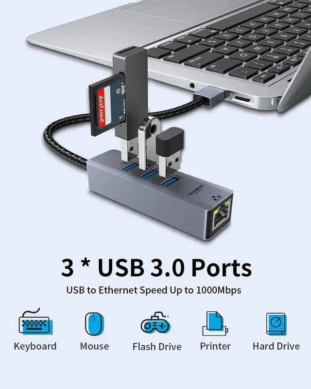 This USB-A to USB 3.0 Hub RJ45 Gigabit Ethernet 1000 Mbps Adapter is perfect for fast and secure access to your network. It offers a data transfer rate of up to 5Gbps, 3 USB 3.0 ports for connecting USB devices, and a lightweight and portable design. It is compatible with Windows, Mac OS, Laptop, PC, Smart TV, Switch, Apple, and more. Keywords: USB, Ethernet, Adapter, Hub, RJ45, Gigabit, 1000 Mbps, Windows, Mac OS, Laptop, PC, Smart TV, Switch, Apple, 5Gbps, USB 3.0, CE, FCC.