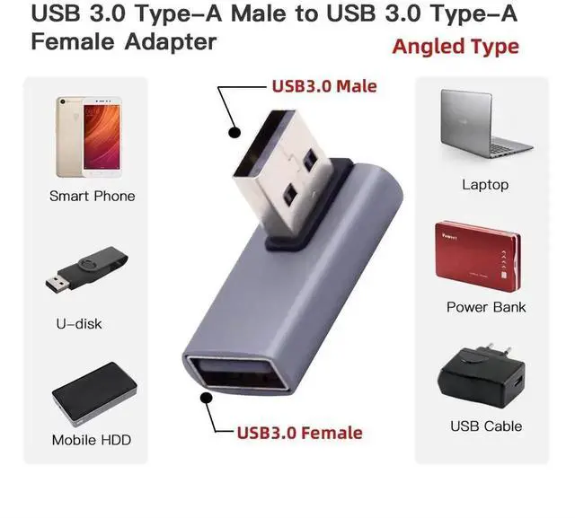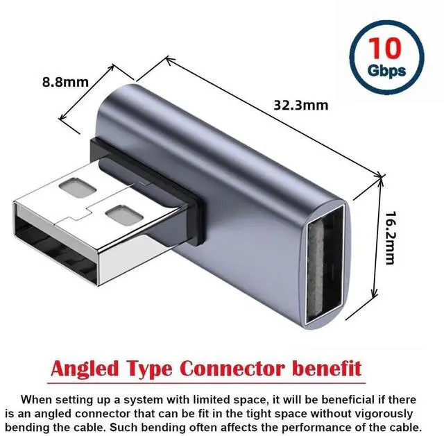 2. Angled USB 3.0 Adapter, Type A Male/Female,Support 10Gbps data transfer rating.