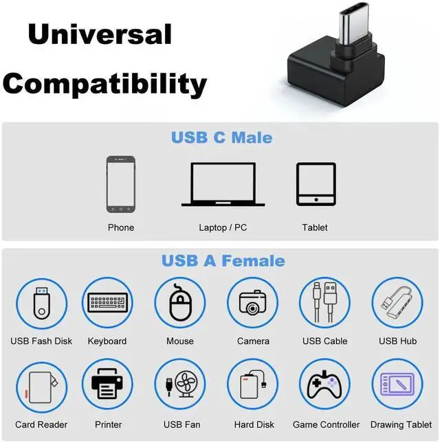 Up and Down Angle Design This USB C to USB adapter adopts a vertical 90 degree L-shape design, which is convenient for use in a narrow space. USB cable and other USB devices are easier to connect.