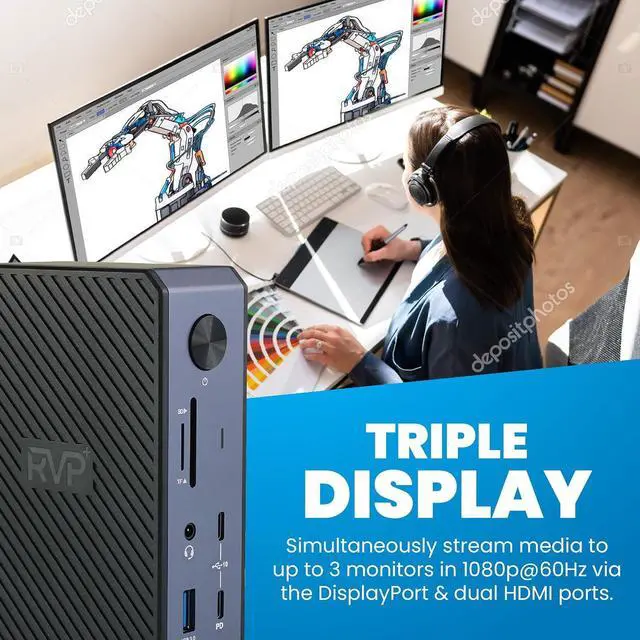 • Simultaneously stream media to up to 3 monitors in 1080p@60Hz via the DisplayPort and dual HDMI ports.