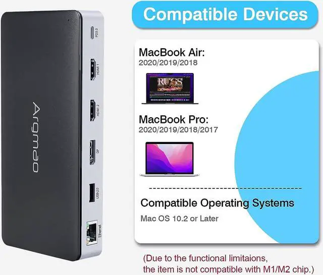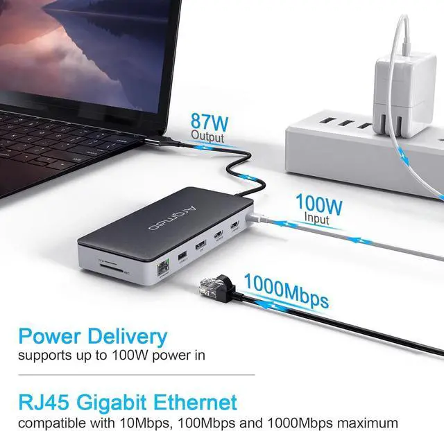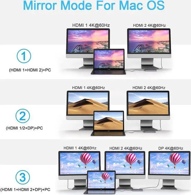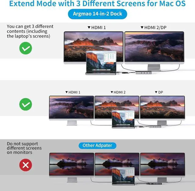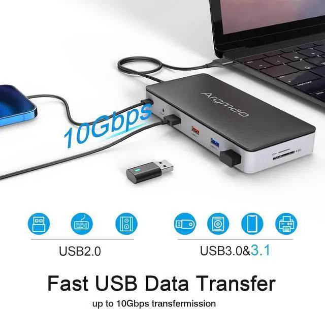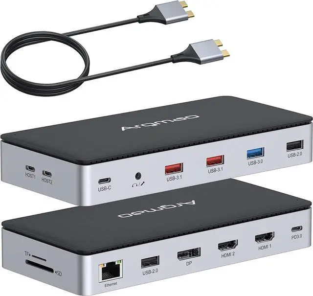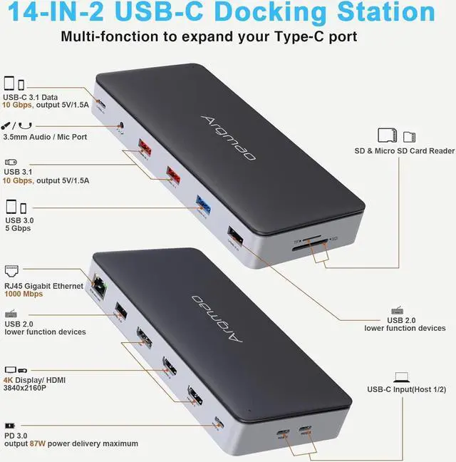 The Argmao 14-in-2 USB-C Docking Station features 14 ports to enlarge your workspace by just two USB C port on your laptop.The dock comes with 2 HDMI and 1 DP ports, allowing you to extend triple displays at the same time.If connect single monitor, the resolutions of display ports can up to 4K@60Hz when the Host side is DisplayPort (DP) 1.4 (HBR3).Enjoy the speedy transmission and excellent picture quality of 4K video.