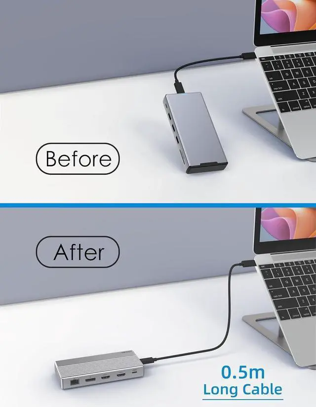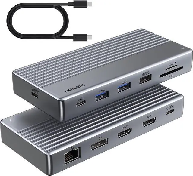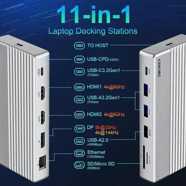 11-IN-1 USB Docking Station: Featuring a USB-C data port, two USB-A 3.0 (5Gbps), one USB-C (5Gbps) slots, dual HDMI and a DisplayPort for seamless usb to usbc-c adapter use. The 100W USB-C power port boosts this usb c dock charging capabilities, supporting high-definition triple-screen expansion. Includes an SD/microSD card reader and Ethernet port, perfect for dual monitor setup via the dual monitor adapter function.