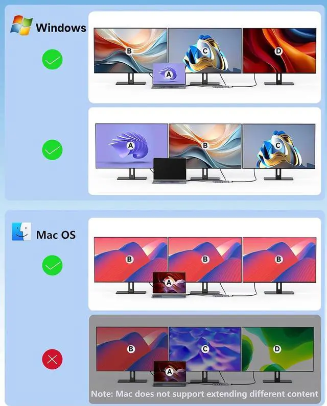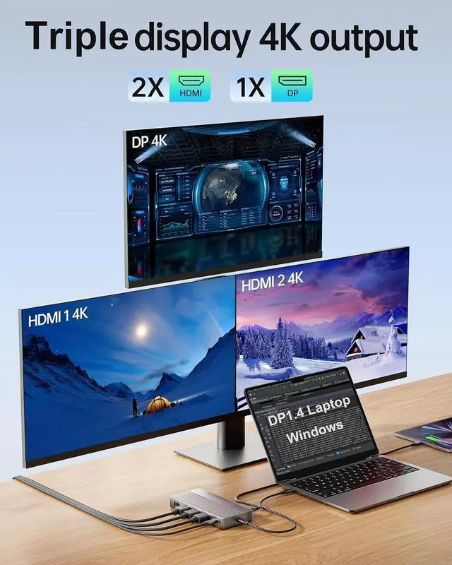 Triple 4K Display: This universal docking station is outfitted with dual HDMI and one DP port, supporting single-screen mode at DP 8k@30Hz, 4k@144Hz, and 4k@120Hz. When in dual-screen mode it operates dual HDMI or DP+HDMI up to an impressive 4k@60Hz. The triple display function also supports up to 4k@60Hz. Integrated with a USB-C to USB adapter and USB-C hub, this enables seamless MST and SST functionality on Windows OS. (note: MacBook users can only access mirror mode.)