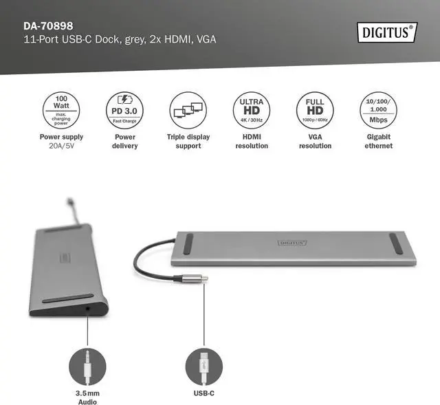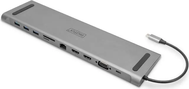 The DIGITUS® multifunction docking station gives you everything you need to create a fully equipped workstation. Through the 2x HDMI® and VGA connection you can expand your desktop with 3 additional monitors or connect projectors / TVs. Together with your existing monitor you can represent your shared desktop on a maximum of 4 screens or expanded to a maximum of 3 displays (2 enlarged + 1 shared). In addition, the docking station is equipped with a USB-C connection with Power Delivery (PD) functionality, allowing you to charge your connected notebook/tablet during operation. Three additional USB connections provide enough space for connecting other portable devices that can be charged and used at once. Of course, other peripheral equipment can also be connected, e.g. a mouse or keyboard, via the 3 USB 3.0 ports. Two card readers for SD/TF and MicroSD cards and a Gigabit Ethernet connection are also integrated, allowing you to connect your notebook via the docking station and via a network cable to the local network or the Internet. This desktop multi-tool is complete with a stereo audio connection that enables the use of a microphone, speaker or headset. Expand your notebook, tablet or smartphone through a single USB-C port with the multifunction docking station DIGITUS®.