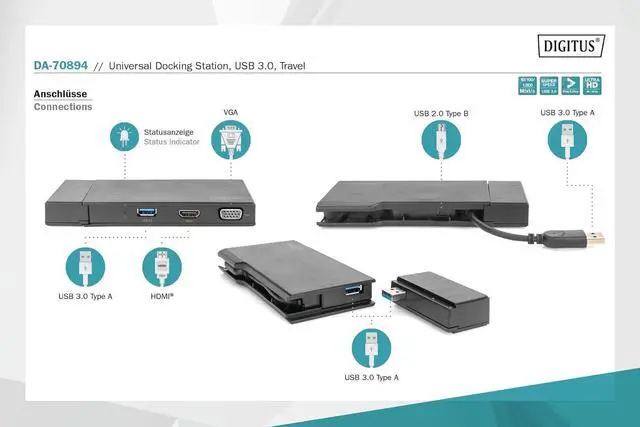 • DIGITUS Universal Docking Station, USB 3.0, 7-Port, Travel 2X Video, 2X USB 3.0, RJ45, 2X Card Reader
