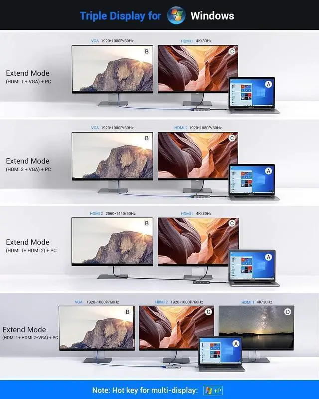 Triple 4K Extended Displays: usb c docking station Support 3 monitors up to 4K(DP 4K@60Hz HDMI 4K@30Hz).Easily setting mirror /extend/primary video mode.Support Different Screen of Multi Monitors.Please note DisplayPort and HDMI are separate standards which utilize different cables and connectors. Most PC monitors and all TVs do not have DisplayPort connections. Conversion to HDMI, Single-Link DVI, or VGA is possible via adapters.