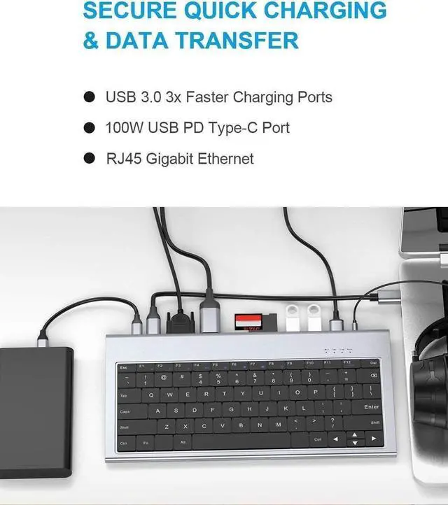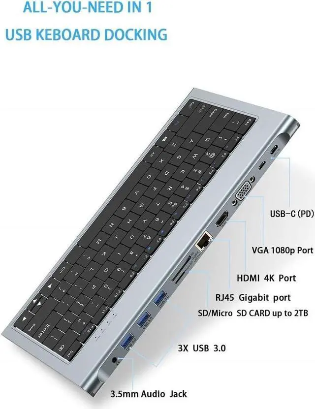 USB Wired Computer Keyboard,11 in 1 USB C Docking Station with 4K HDMI, 3 USB Ports, 100W PD, SD/TF, Ethernet, 3.5 Audio