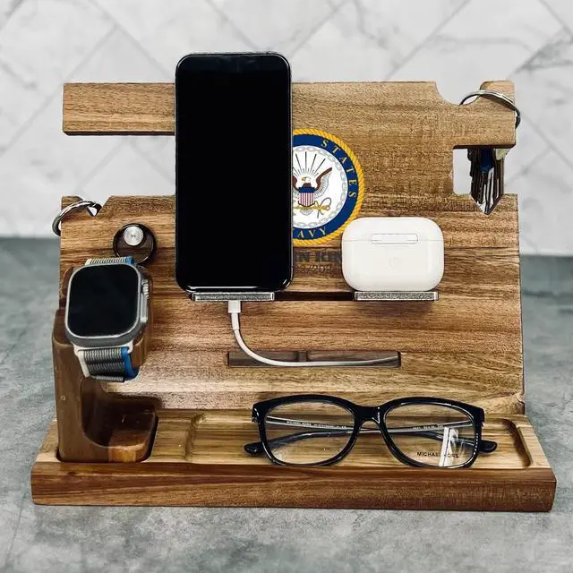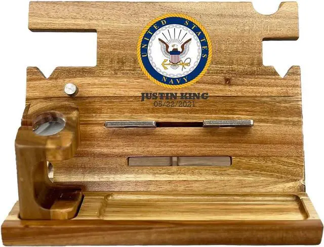 Honor a service member with our Personalized Military Docking Station, uniquely designed with their name and rank. This custom-engraved accessory offers a personal touch that sets it apart, making it a memorable gift. The docking station is handcrafted from durable, high-quality wood, showcasing a rustic charm that complements any desk or bedside table. More than a phone holder, it's a practical organizer, keeping daily essentials - keys, wallet, watch - neatly organized and within easy reach. Our docking station is universally compatible, accommodating various smartphone models. It ensures that the device is always secure, accessible, and in full view. Searching for the perfect military gift? Our personalized docking station is an excellent choice. Ideal for promotions, retirements, holidays, or just as a token of appreciation, it blends practicality with a personalized touch. Show your appreciation for a service member with a gift that's as unique and special as they are. We are committed to delivering high-quality products. However, if for any reason you're not fully satisfied with your purchase, we offer hassle-free returns. Express your gratitude to a service member and order your personalized military docking station today!