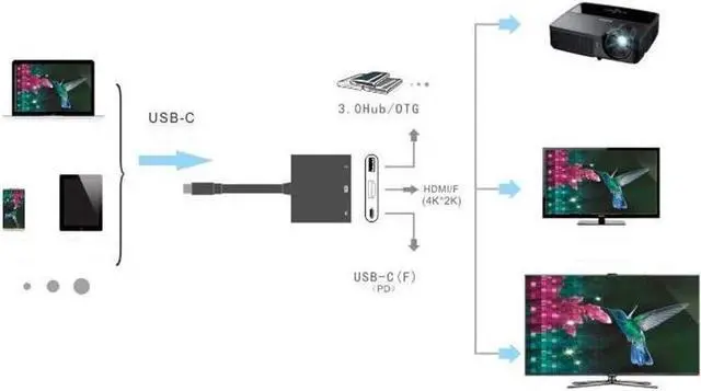 Widely used in: the latest generation of laptops, mobile phones, tablets, etc. with USB 3.1 Type C interface. After connecting through this conversion cable, it can be converted into HDMI (4K * 2K) / VGA + Aduio multifunctional application output, supporting PD upstream power supply.