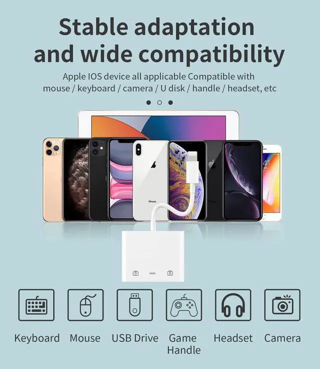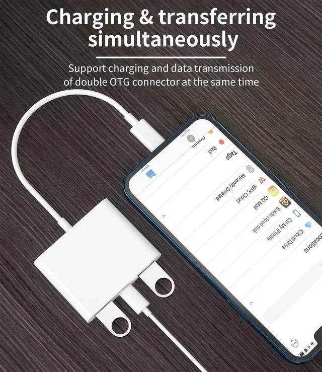 Camera Reader: Dual USB OTG adapter can more conveniently transfer photos and videos to iPhone / iPad from digital camera support charging iPhone / iPad at the same time. For iOS 13 and above also supports the use of the mouse function.