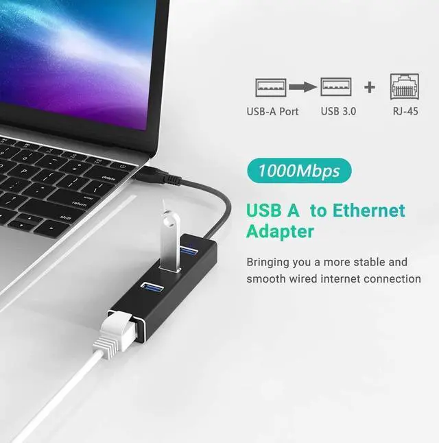 • [3 Ports + Fast Network Interface] The USB Ethernet hub has 3 USB 3.0 ports and 1 RJ45 Gigabit Ethernet port, which can help expand accessibility on devices, such as laptop, PC, etc. Three USB 3.0 ports with data transfer speed up to 5Gbps could transfer an HD film in seconds, which are also compatible with USB 2.0/1.1 devices.