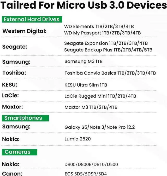 - Samsung phone equipped with USB 3.0 Micro-B port: Samsung Galaxy S5, Samsung Galaxy Note 3, Note Pro 12.2;