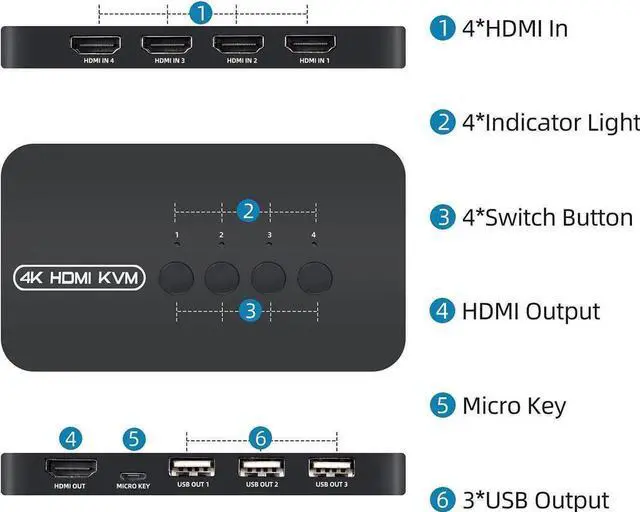 Ideal Sharing Switches: The HDMI USB KVM Switch can share one HD 4K monitor and 3 USB 2.0 devices such as scanner mouse keyboard between 4 computers.