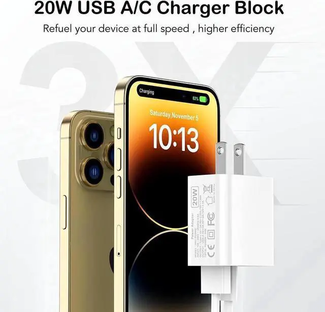 Type C wall charger offers fast and efficient charging up to 3X faster than a 5W charger. Charge your iPhone 13 up to 50% capacity in just 30 minutes with the original cable. (Cable not included, only 3 Chargers )
