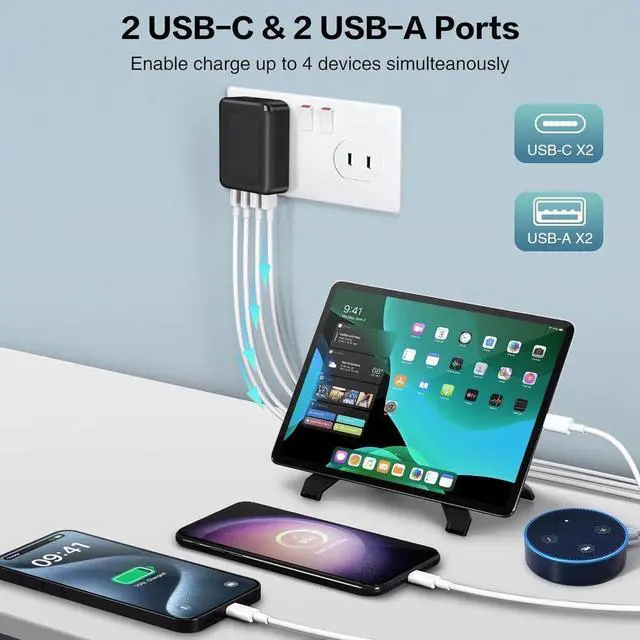 [Reliable Charging]- The USB wall plug delivers a total of 40W of power across its 4 ports, ensuring optimized current distribution when charging four devices simultaneously. Additionally, it provides a dedicated 20W maximum power output when using a single C1 or C2 port to charge a single device.