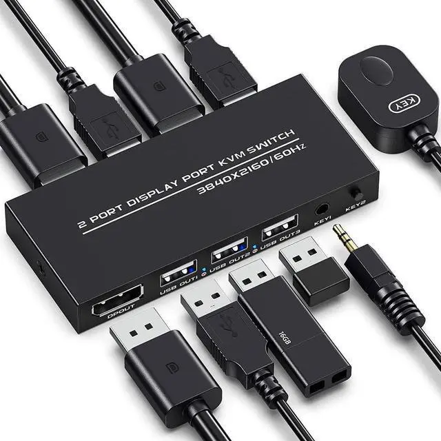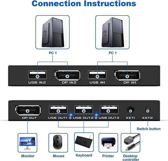 [2 Port DisplayPort KVM Switch] The KVM switch Displayport is a displayport switch that can help you sharing one monitor and 3 USB 2.0 devices such as scanner mouse keyboard between two PCs.