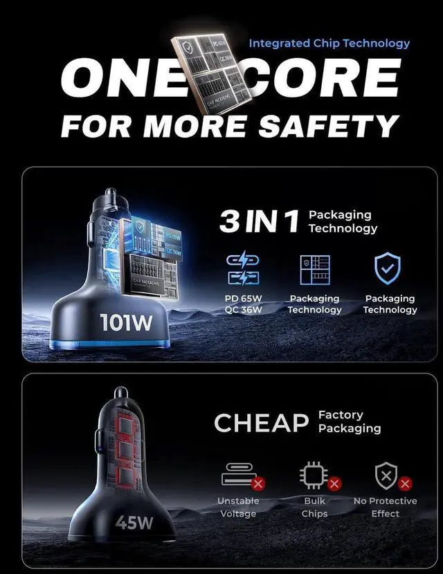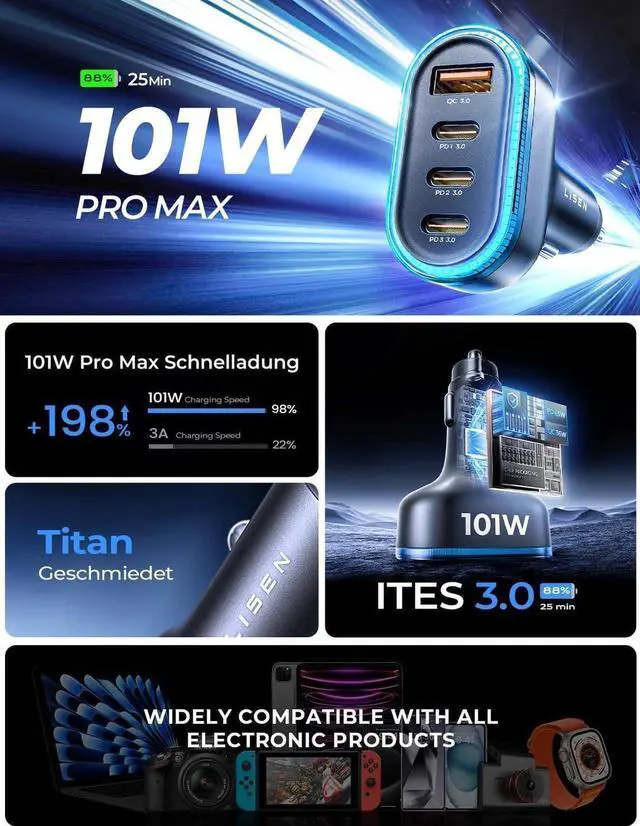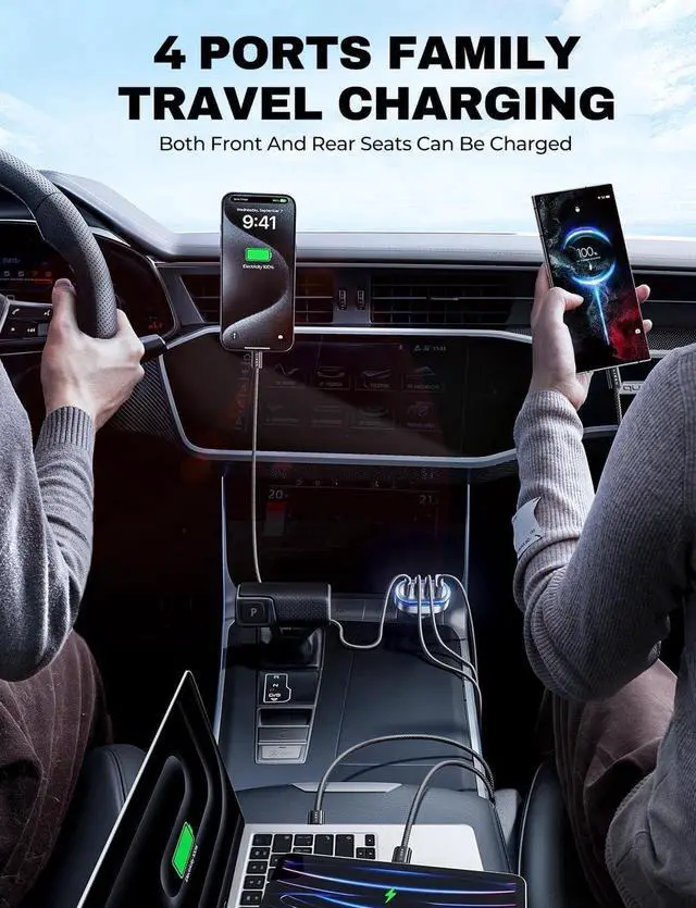 20mins Super Fast Charging & 101W Usb C Car ChargerThe 2024 latest upgrade cigarette lighter adapter has one QC 3.0 Usb port and 3 PD 3.0 Type C ports, Charge 4 devices such as Android, iphone, ipad and laptop at the same time does not result in slow charging.
