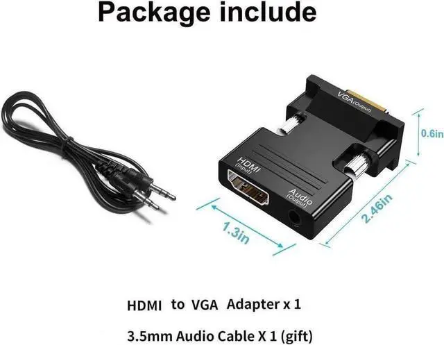 1080P FULL HD ResolutionHDMI-VGA Adapter support resolution 720P/1080i/1080P 3D HDMI V 1.4. Plug & play No any driver or program required. With this HDMI to VGA with audio its easily to create home theater or make presentations at meetings. Audio Video Sync Supported Converts HDMI digital signal to VGA analog signal; 3.5 mm audio port sends audio to speakers or a display( 3.5 mm stereo cable included); power supply interface: Micro USB backup power supply solve the problem that high power device used instability with insufficient power supply. Convenient and convenientPortable HDMI to VGA adapter / converter. Simply connect older computers / notebooks with HDMI output to a TV monitor or projector with VGA input to stream videos play games or share content. Widely compatibledesktop notebook ultrabook notebook projector DVD HDTV media player cable box or other devices with HDMI connection. Plug and play no drivers required no external power supply required. What You'll Get 1x HDMI to VGA