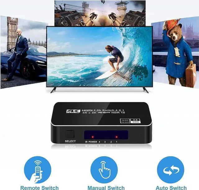 4 Inputs 1 Output 4K@60Hz HDMI Switches - This 4 ports HDMI switch supports HDR10, HDCP 2.2 (Also backward compatible with HDCP 1.4, 1.3 ), supports