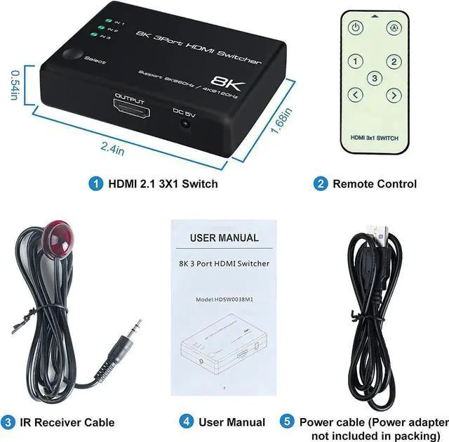 3 in 1 Out HDMI 2.1 Switch 8K@60Hz, 4K@120Hz HDMI Switcher 3 Port, 8K HDMI Auto Switch 3x1 Selector with IR Remote for Xbox,PS5,PS4,UHD TV, Support 48Gbps, HDCP 2.3,HDR 10+, 1080P@240Hz