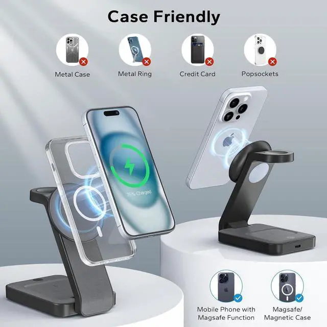 Not for Non-magsafe CasesIf you prefer wearing a case for your phone, please make sure it' s a MagSafe case or magnetic case. Built in with dedicated magnets, the iphone and apple watch charging station provides precise mag safe alignment for your devices. Wireless solid magnetic connection ensures the convenience and security of charging and holding your devices in any orientation portrait or landscape.