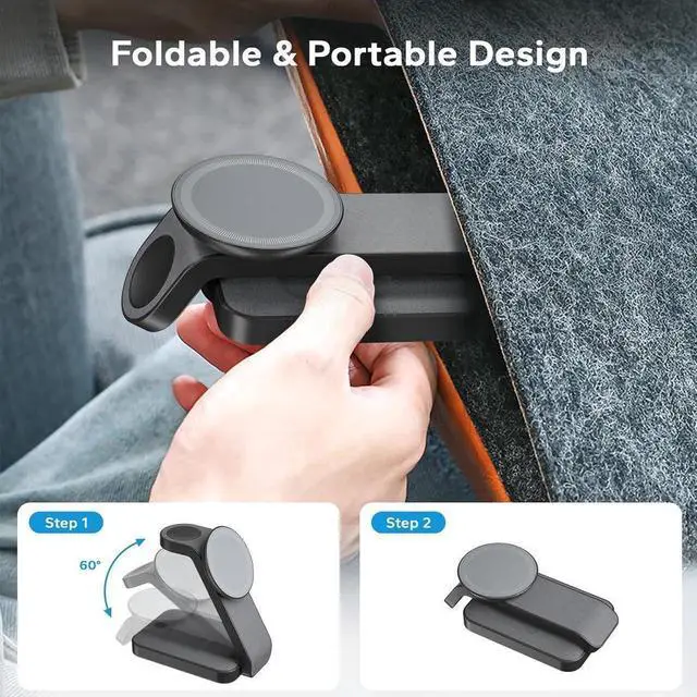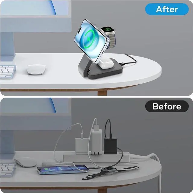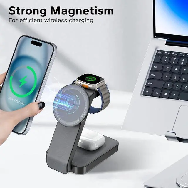 3 in 1 Wireless Charging StationThe foldable charger 3 in 1 apple can charge your iPhone, Apple Watch, and AirPods simultaneously. Say goodbye to tangled cords and plug in or out troubles. Perfect wireless charger stand for MagSafe for iPhone 15/15 Plus/15 Pro/15 Pro Max/14/13/12/SE/X/11/8 series, Samsung Galaxy S23 Ultra/S23+/S23/S22 and other qi phones. Great iWatch magnetic charger stand for Apple Watch Ultra 2/Ultra/9/8/7/6/5/4/3/2/SE, AirPods Pro 2/Pro/3/2 (with wireless charging case).