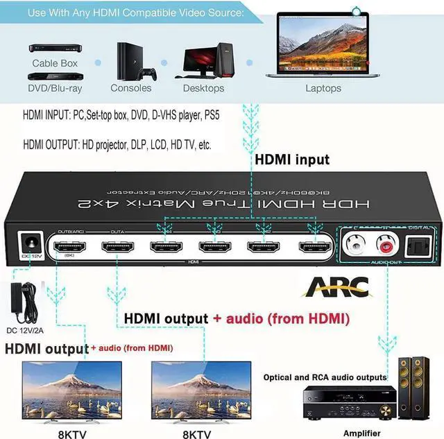 7) If you want to use ARC or CEC, you must connect the TV to the OUT B port. Before using ARC, make sure your TV HDMI port supports ARC and the ARC have been turned on.