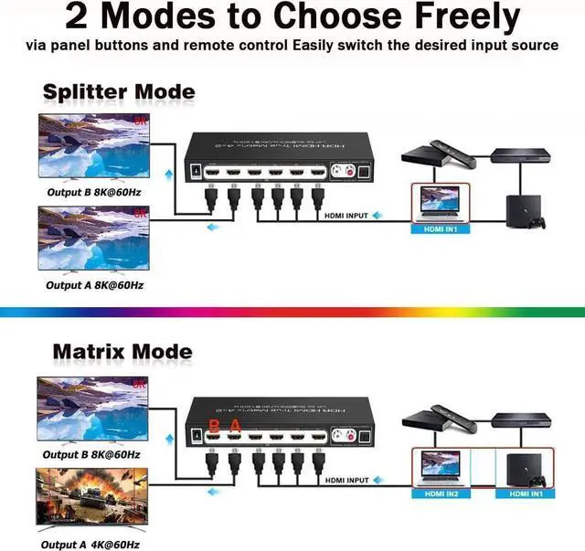2) In matrix mode(In this mode, the outputs of A and B are different), output ports A and B cannot output 8K signals at the same time. Only one group B is allowed to output 8K@60HZ or 4K@120HZ and the other group output 4K60HZ or less.