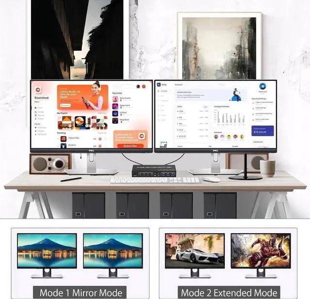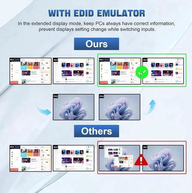 This kvm switch dual monitor 4 port help you control 4 PCs share 2 monitors by only one set of USB keyboard & mouse.