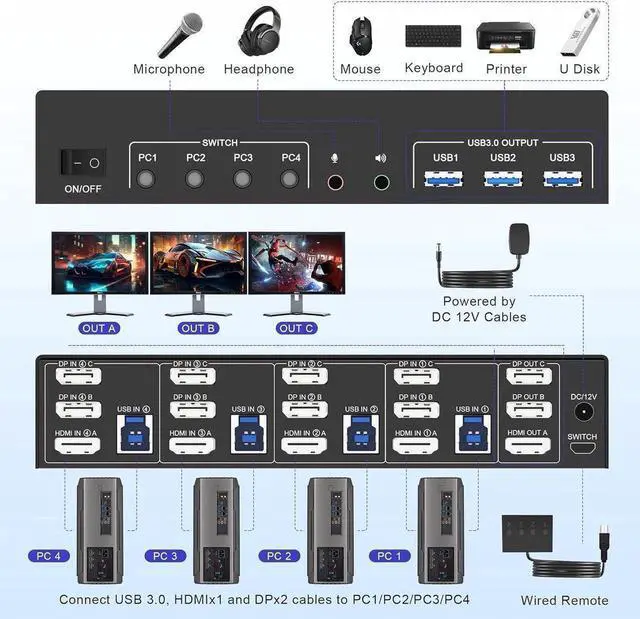 [2 DisplayPort+ HDMI 3 Monitor 4 PC] This KVM perfect for hooking up 4 desktops or laptops to share one set of keyboard, mouse and 3 monitors for extended, mirrored display; It requires every Laptop/PC support 3 screen or above display functions and must support extended display.