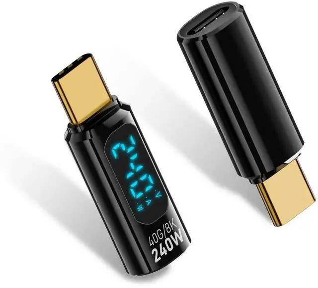 USB C Adapter with LED Digital Display, 240W PD, 40Gbps, USB-C Male to Female Adapter for iPhone 15 Series, MacBook, Support Voltage, Current and Power Smart LED Display (Black-2Pack)