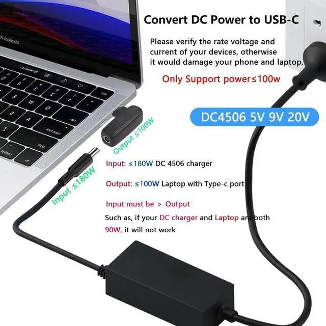 Additional Features- [PD USB C Adapter]It can convert DC 4.5mm x 0.6mm PD power into a laptop with USB Type C from Type-C Charger, perfect solution to the problem that the dc power adapter cannot power the type c port. Note: DC input power must be higher than USB C output power.