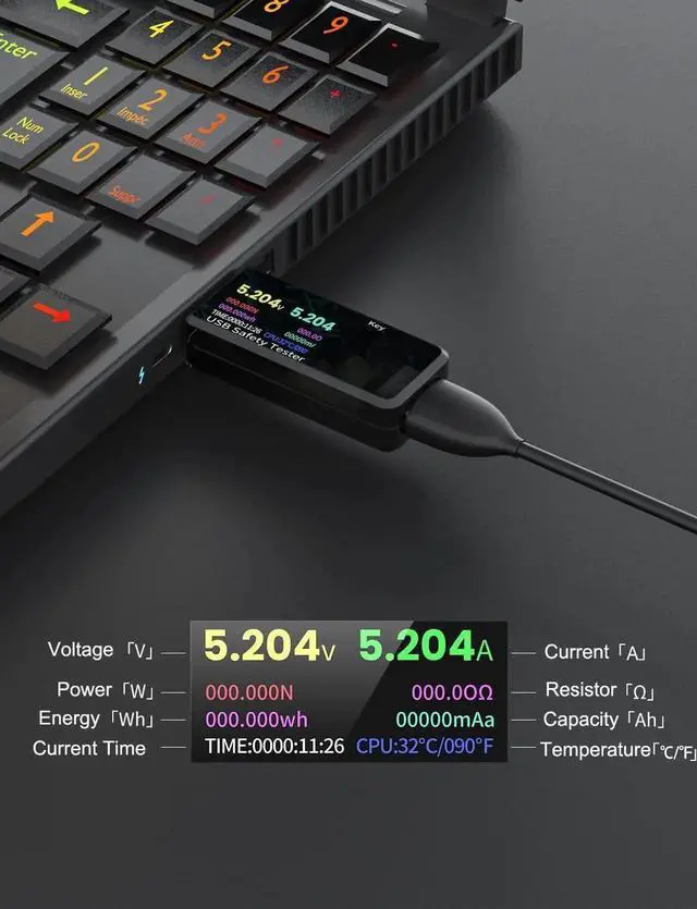 Measuring voltage: 3.7-30V Measuring current: 0-6.5A Capacity measurement range: 0-99999mAh Energy measurement range: 0-99999mAh-999.99Wh Load impedance measurement range: 1-9999.9 Temperature measurement range: 0°C-65°C / 32°F-149°F Operating temperature range: 0°C-45°C / 32°F-113°F Product size: 64mmx22mmx12mm Display screen: 0.96 inch color LCD Voltage measurement resolution: 0.01V Current measurement resolution: 0.001A Voltage measurement accuracy: ± (0.1% + 2words) Current measurement accuracy: ± (0.2% + 4 words) Power measurement range: 0-120W Refresh rate: 0.5Hz Package Including 1 * USB Tester