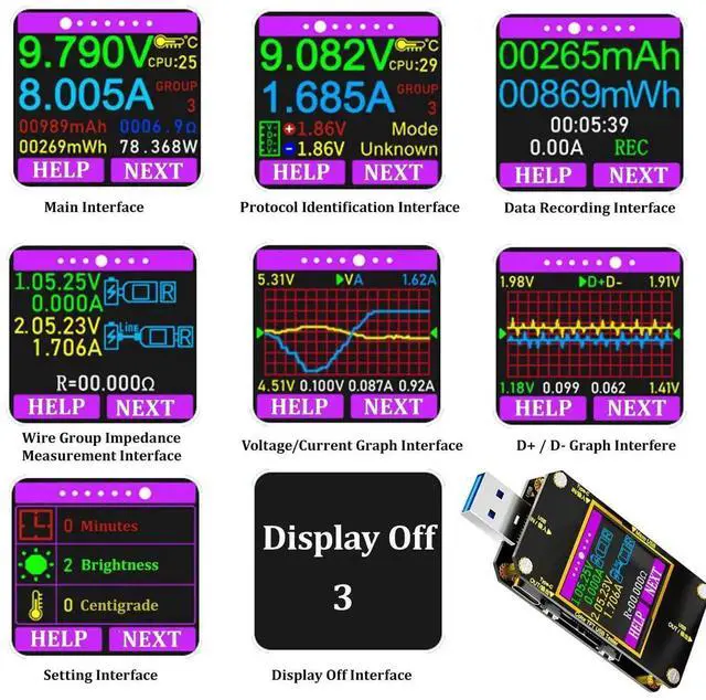 [BRIGHT COLOR DISPLAY INTERFACE]: 1. Measurement Main Interface 2. Quick Charge Identification Interface 3. Data Recording Interface 4. Wire Group Impedance Measurement Interface 5. Voltage Graphing Interface 6.Current Graphing Interface 7. Settings Interface. Voltage measuring range 4.5-24V; current measuring range 0-3A.