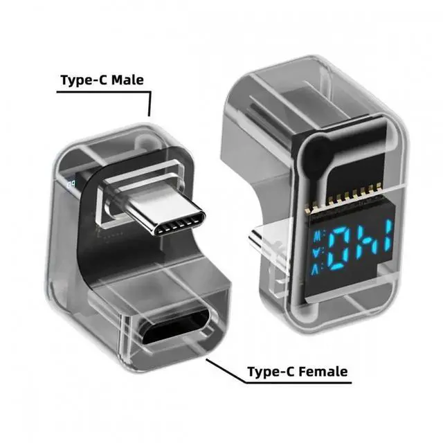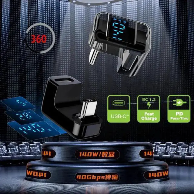 Type-C Smart LED Display USB-C Male to Female Extension Adapter USB4.0 40Gbps 140W Opposite U Shape Back Angled Current Voltage Monitoring